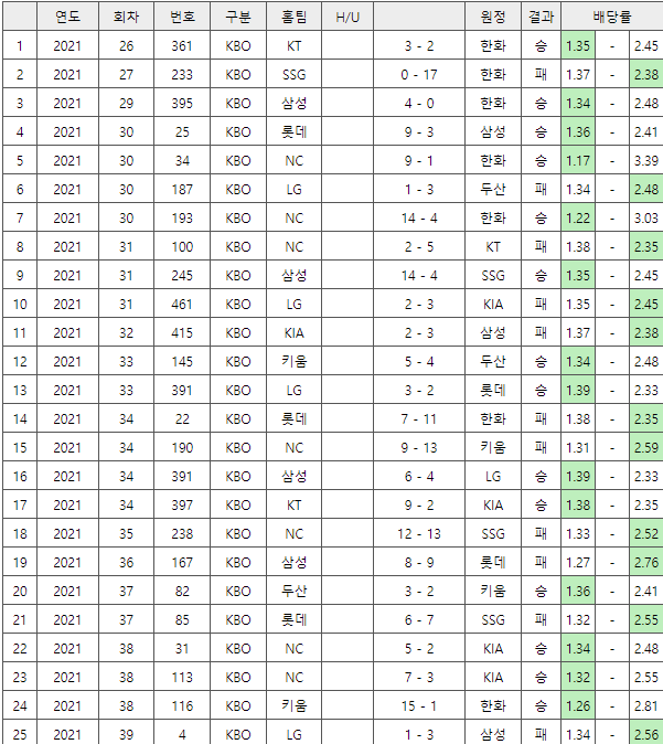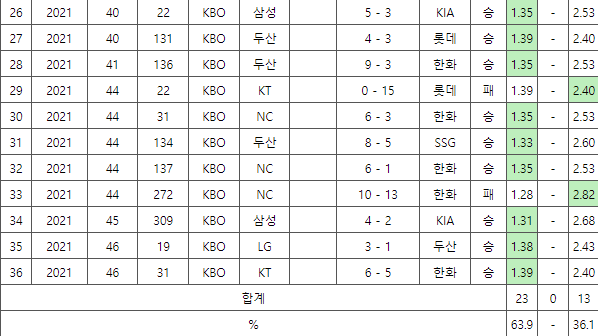 올시즌 1.3대 이하의 배당들은 36번 출현하였고 23번이 정상적으로 들어왔고