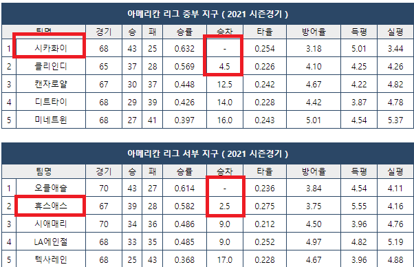 휴스턴은 1위 오클을 향해 따라가는 입장입니다