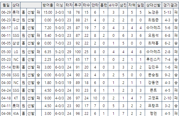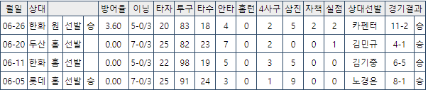 직전원정경기였던 두산원정에서도 6이닝 0실점을 기록하기도 했습니다