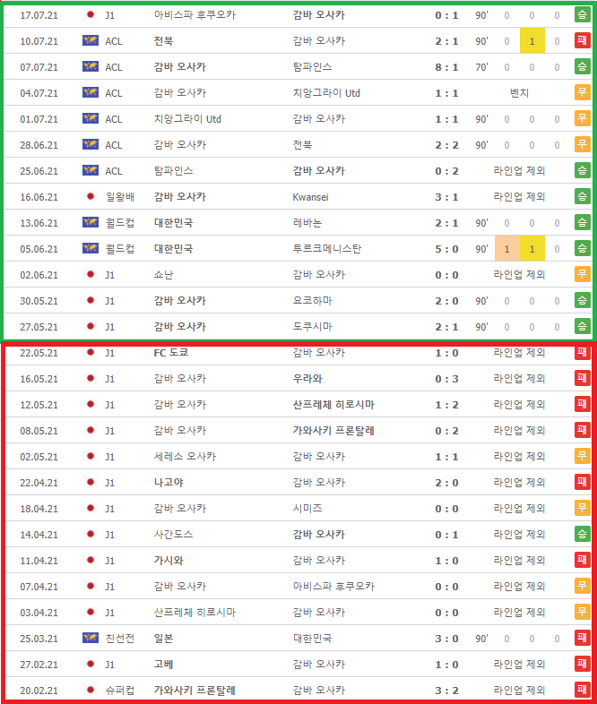 밑의 빨간체크박스는 김영권의 부상으로 빠져있을때 감바의 성적이고