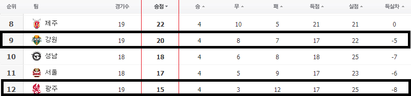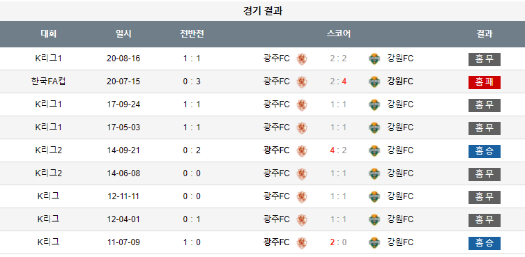 보시는 대로 무승부가 상당히 많고 광주가 홈에서 강원에게 패배를 한적은