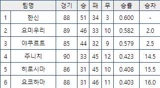 0.5게임차 오늘 야쿠가 이기면 2위로 올라섭니다