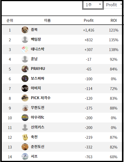 | 순위 | 이름 | 프로핏 | ROI | PICK |