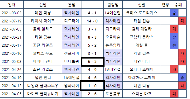 텍사스는 화요일에 4승 7패 / 원정 1승 4패 인데