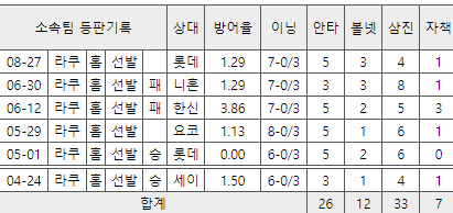 최근 5경기 34이닝 7실점    평균 7이닝 1-2실점 정도 보면 되겠져