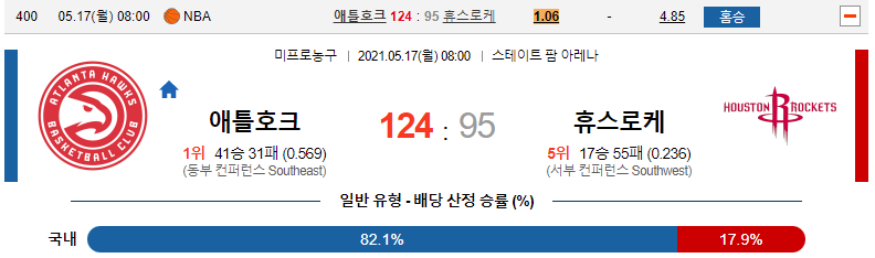휴스턴의 원정역배승 가능성이 17.9% 니깐