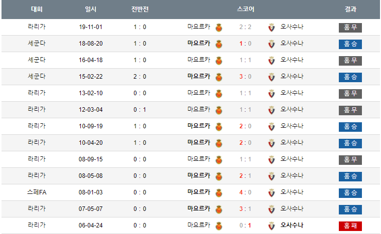 마요르카홈에서 오사수나와의 상대전적을 살펴볼때