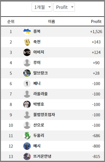 | 순위 | 이름 | 프로핏 | ROI | PICK |