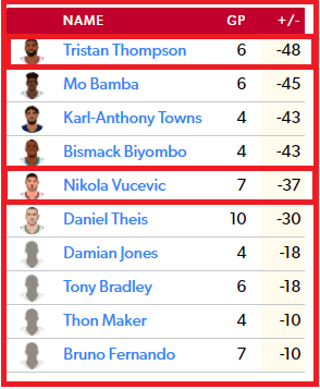 반대로 필라상대로 센터들중에 득실마진이 안좋은 순위대로 나열한겁니다