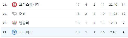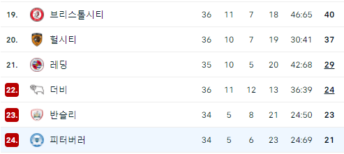 24위꼴찌고  5승 6무 23패 인데   득실을 봐야합니다   24득 69실
