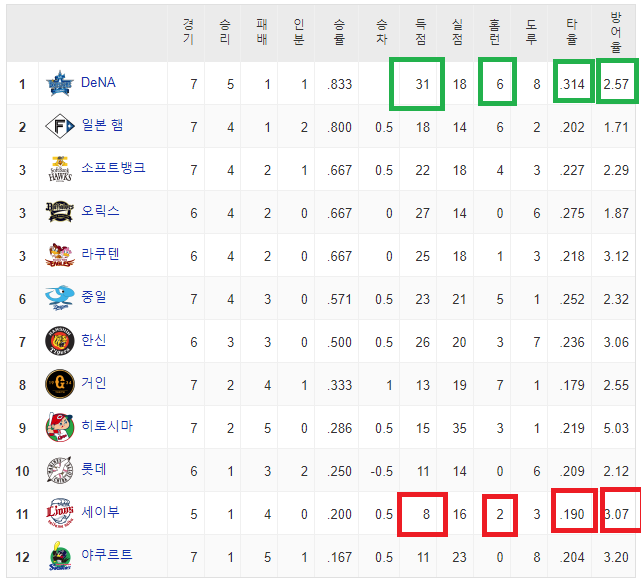 상대적으로 세이부가 5경기 8득점인데 평균적으로 1.6 이라는 얘기져
