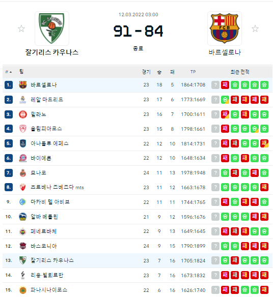 당시 상대팀은 유로리그 1위 바르셀로나 였습니다