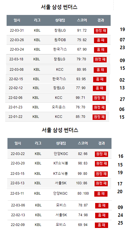 아무래도 1-2-3-4위랑 할떄는 15점 이상차 패배가 많습니다