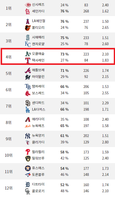 좌투한테는 MLB 전체1위에 해당하는 팀이기때문입니다