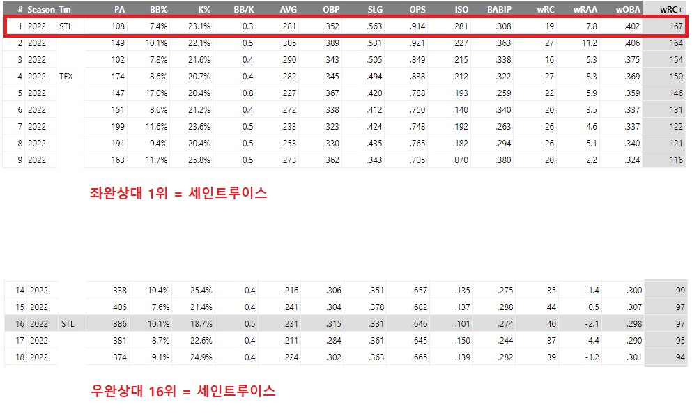 그러나 좌완을 상대하는 텍사스는   MLB 전체4위에 해당하는 전형적인 좌상신의 팀입니다
