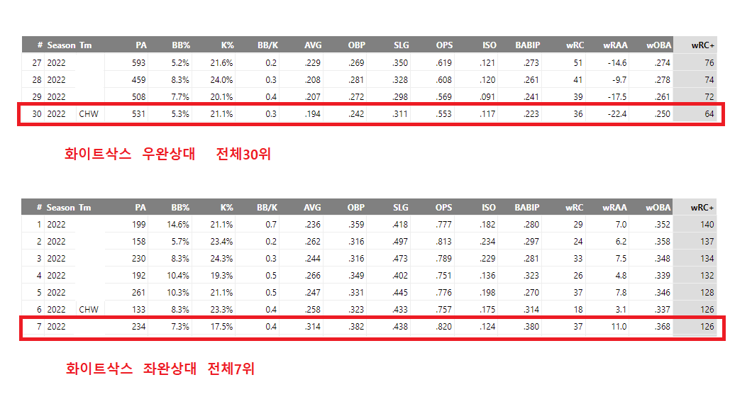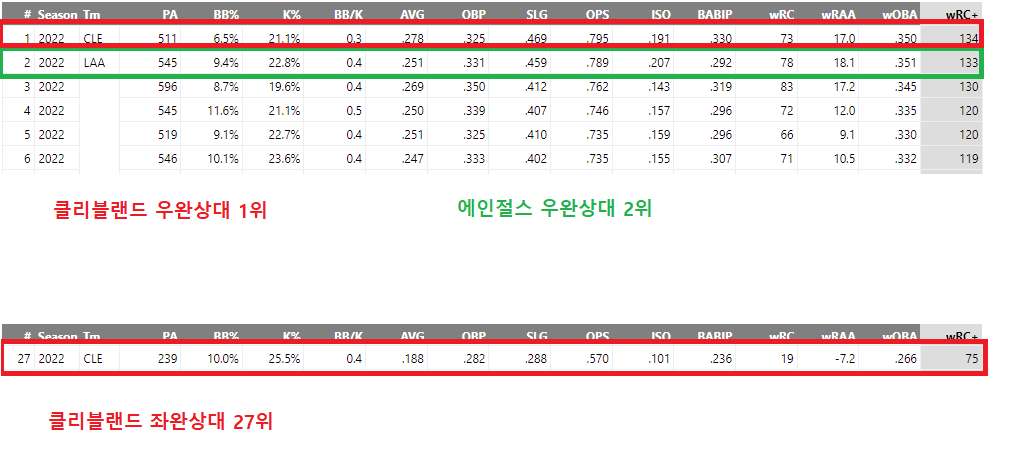 클리블랜드는 우완상대로 전체1위 지만 , 좌완상대로는 전체27위 입니다