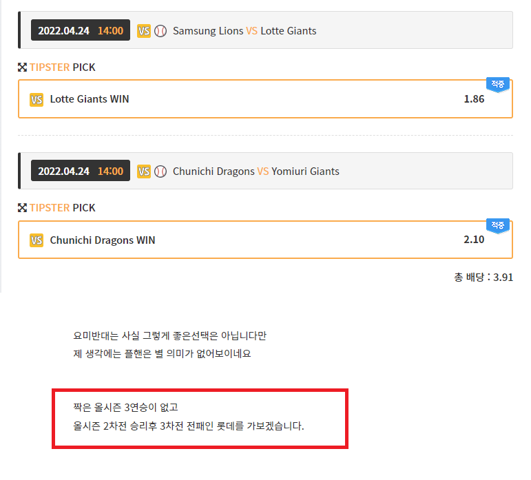 올시즌 3연승을 해본적이 없는 롯데를 선택했습니다
