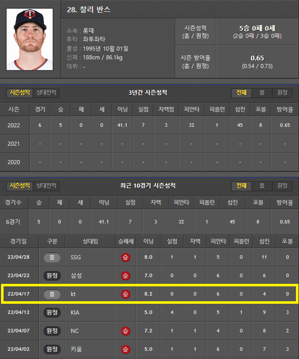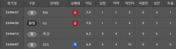 그리고 가장 최근경기에서는 7이닝 0실점 이었긴 합니다