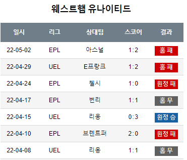 웨스트햄의 최근 한달동안 유로파와 리그성적 입니다