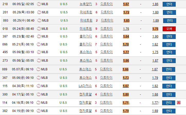 디트가 원정에서 8.5 기준점을 받은 14번에서 13번이 8.5기준 언더 입니다