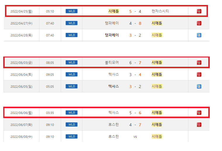 4월 25일 / 6월 3일 / 6월 6일  시애틀 경기를 찾아보시면 될것 같습니다