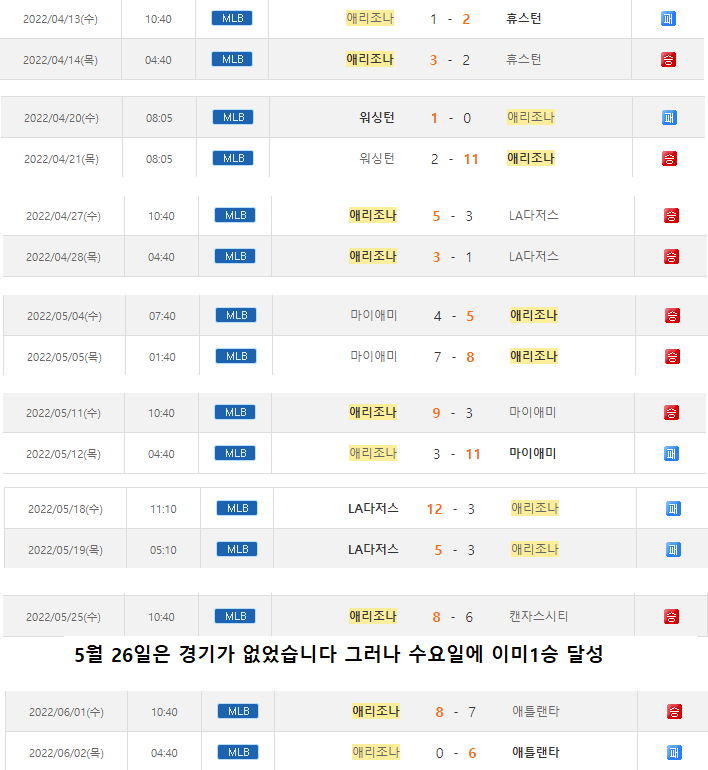 그런 애리조나가 수-목  주중 2경기에서 모두 패배를 한 경우는 다저스원정 말고는 없습니다