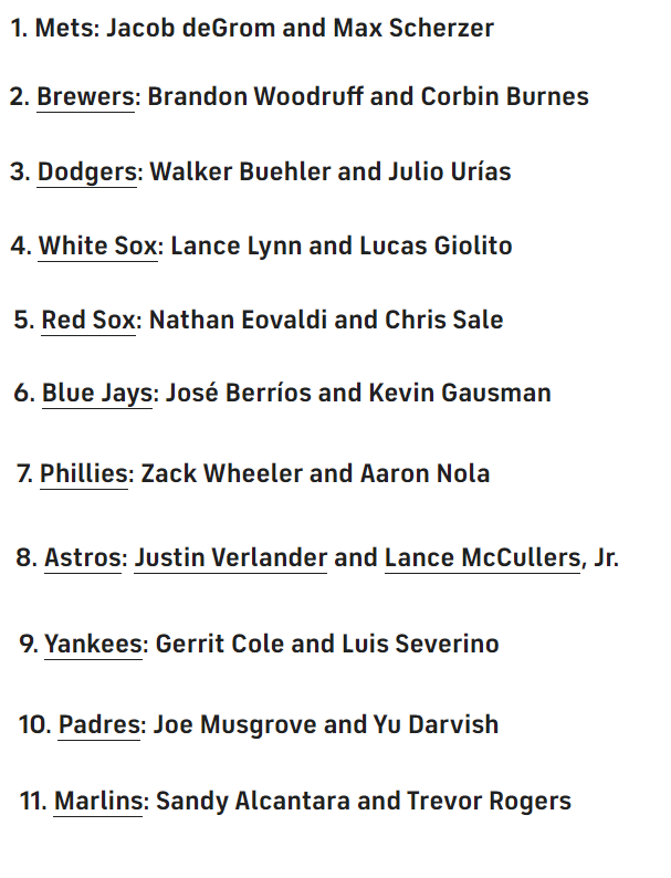 시즌이 시작할때 즈즘에  각팀의 원투펀치  파워랭킹?