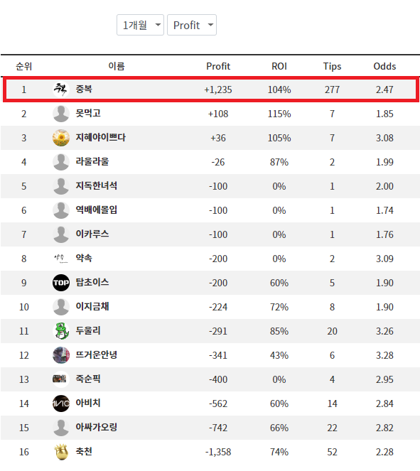 | 순위 | 이름 | 프로핏 | ROI | PICK |