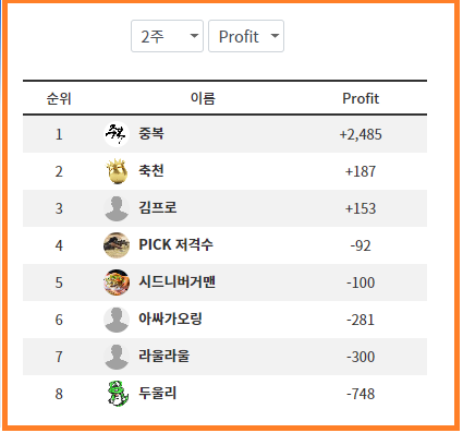 | 순위 | 이름 | 프로핏 | ROI | PICK |