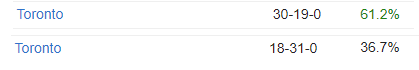 토론토는 홈에서 정배를 부여받으면 30승 19패로 그냥 무난한 수준입니다   61% 정도져