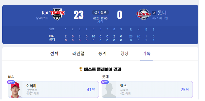 7월 24일 롯데홈에서 23대0 으로 패배를 합니다.