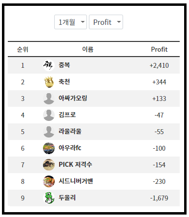 | 순위 | 이름 | 프로핏 | ROI | PICK |