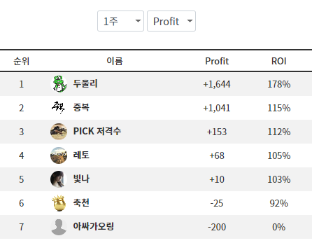 | 순위 | 이름 | 프로핏 | ROI | PICK |