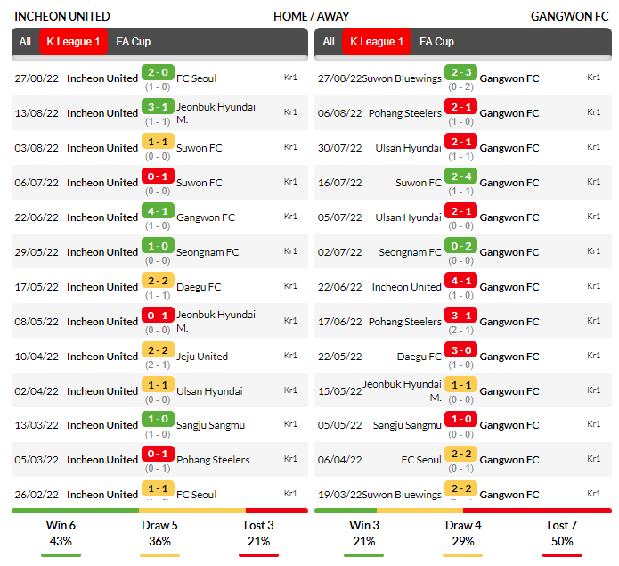 좌측은 홈인천    / 우측은 원정강원 의 기록인데