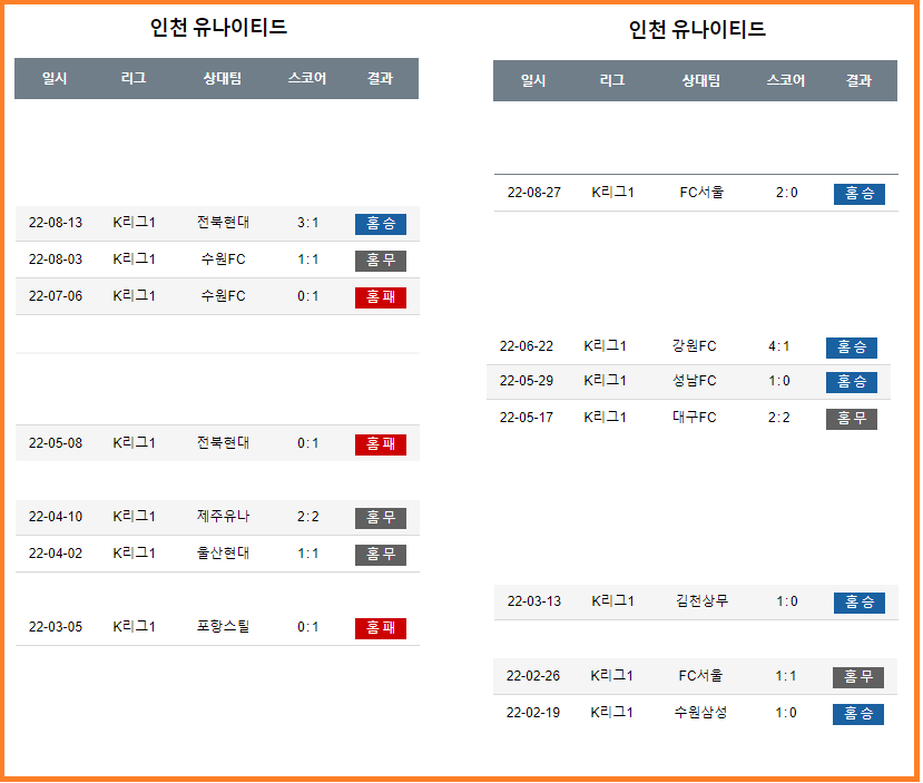 좌측은 인천이 홈에서 상위1-2-3-4-5-6위팀을 상대했을때의 기록 입니다    1승  3무   3패