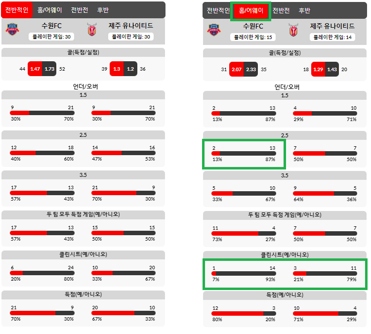 수원FC가 홈에서 2.5기준  15경기 13오버