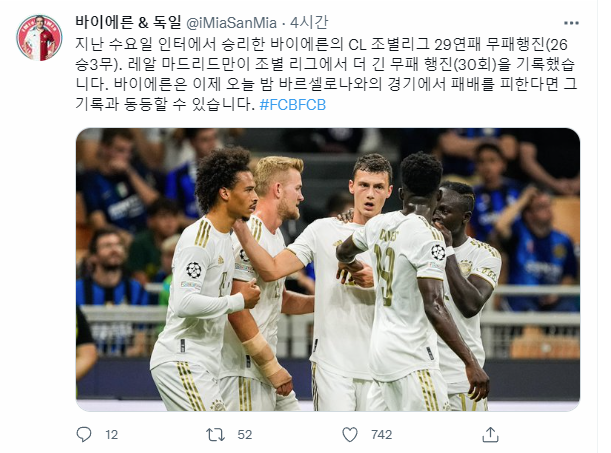 뮌헨의 조별예선 1차전 19연승 중이라고 남겨드렸던거 같은데