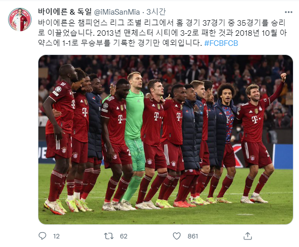 바이에른 뮌헨은 최근 10년간 조별예선 홈30경기에서 28승 1무 1패를 기록중이고