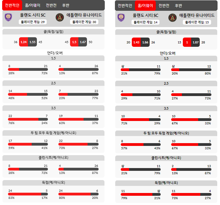 원정팀 애틀란타는     10경기에서 16득 19실     원정10경기는 12득 20실