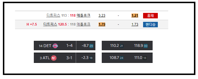승패는 당연히 애틀이 유리하겠지만  핸디는 7.5 라면  굳이따지면 디트쪽이 약간은 유리하겠지만