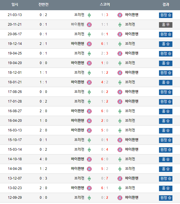 최근 20경기에서 19승 1무로  브레멘을 상대로 너무 전적이 압도적으로 좋네요