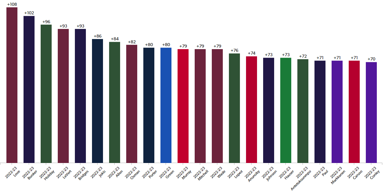 현재 코트위에서 플레이를 할때 가장 마진이 좋은선수들을 나열한 데이터 입니다