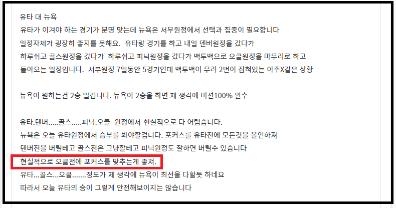 당시 코멘트 인데 첫날 유타전에 포커스를 맞추고 마지막에 오클전에 포커스를 맞춘다