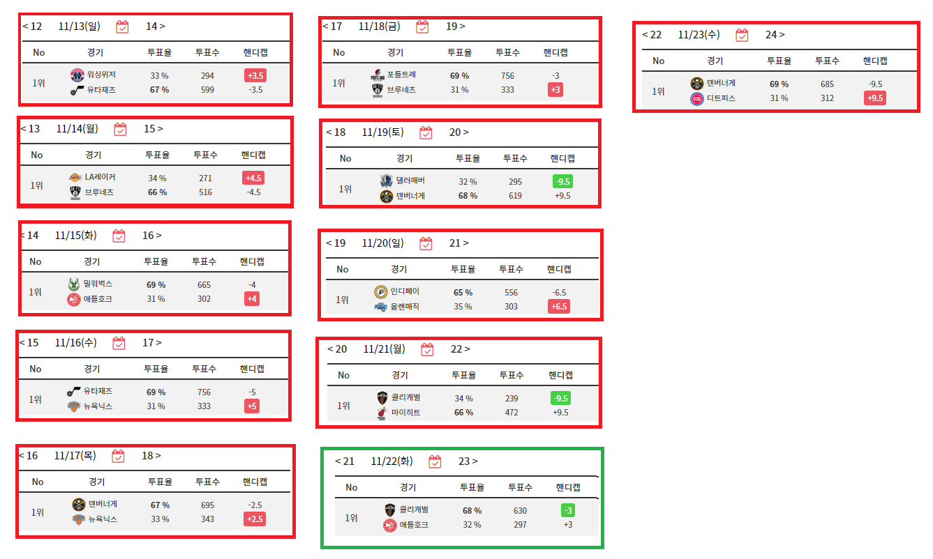 13일부터 어제 23일까지 총  11번의 커버스1위는  10번 부러지고 이틀전   클블VS애틀 경기에서 한번 들어왔습니다