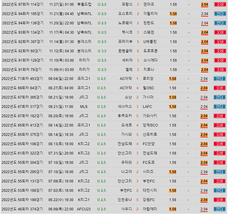 언더 1.58 VS 오버 2.04  배당은    배변이 이루어지면  9경기중 8언더 1오버였고