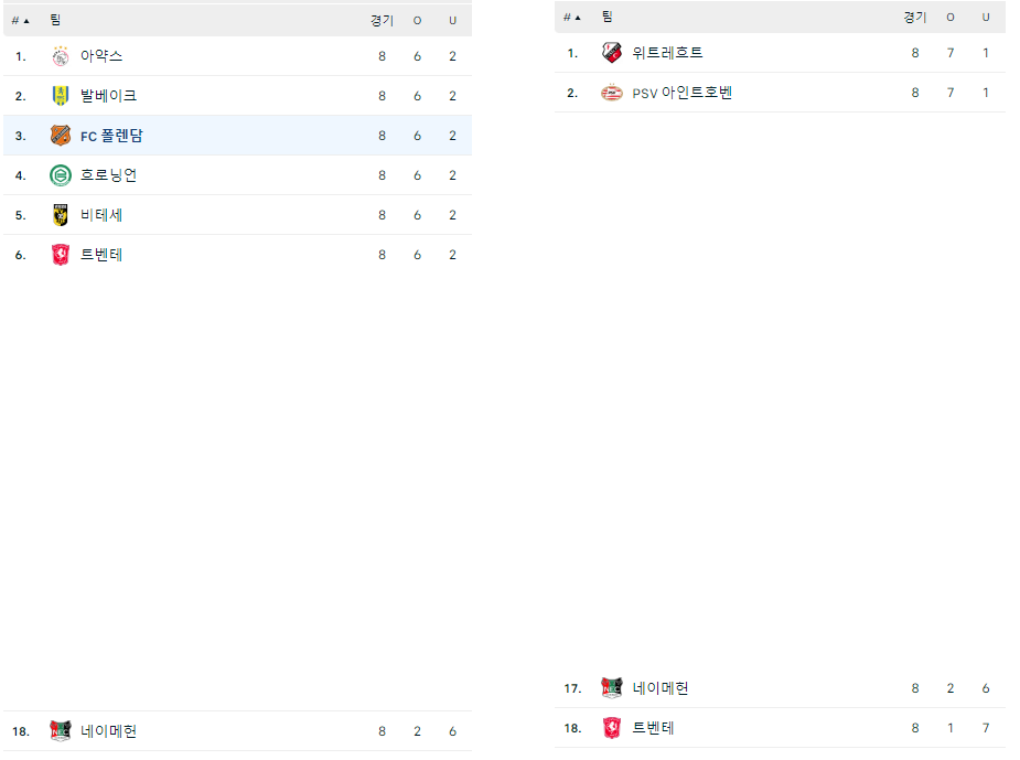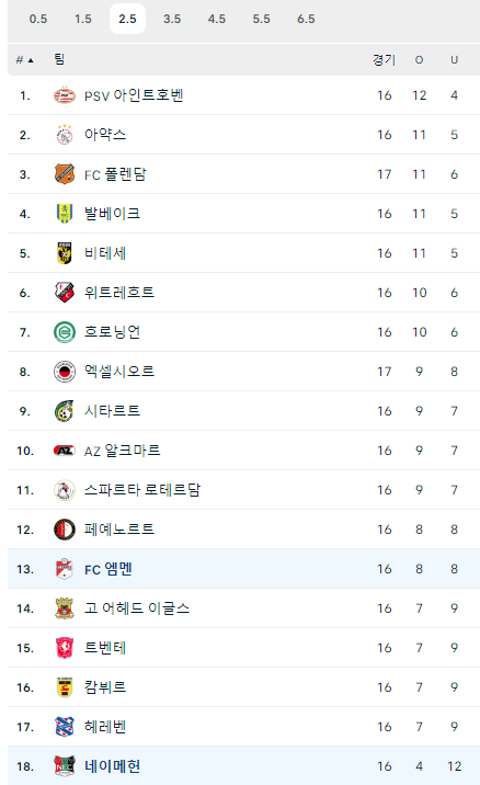 이처럼 언더의 비율이 가장 높은팀이 네이메헌 입니다.
