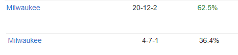 밀워키는 홈에서 마핸+플핸  핸디부여시   핸디승률이 16승 7패 입니다