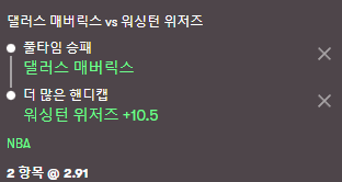 즉. 댈러스가 10점 이내 점수차로 이길 경우.....이 배당은 2.91배 입니다