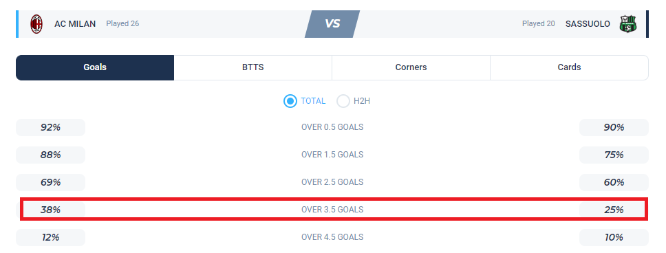 마찬가지로 오버팀의 이미지가 있으나  3.5기준 오버인 4골이상은 고작 25%
