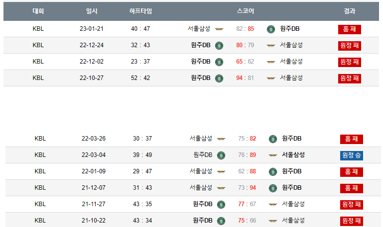 일단 삼성은 11승 28패 이고   디비는  16승 23패로